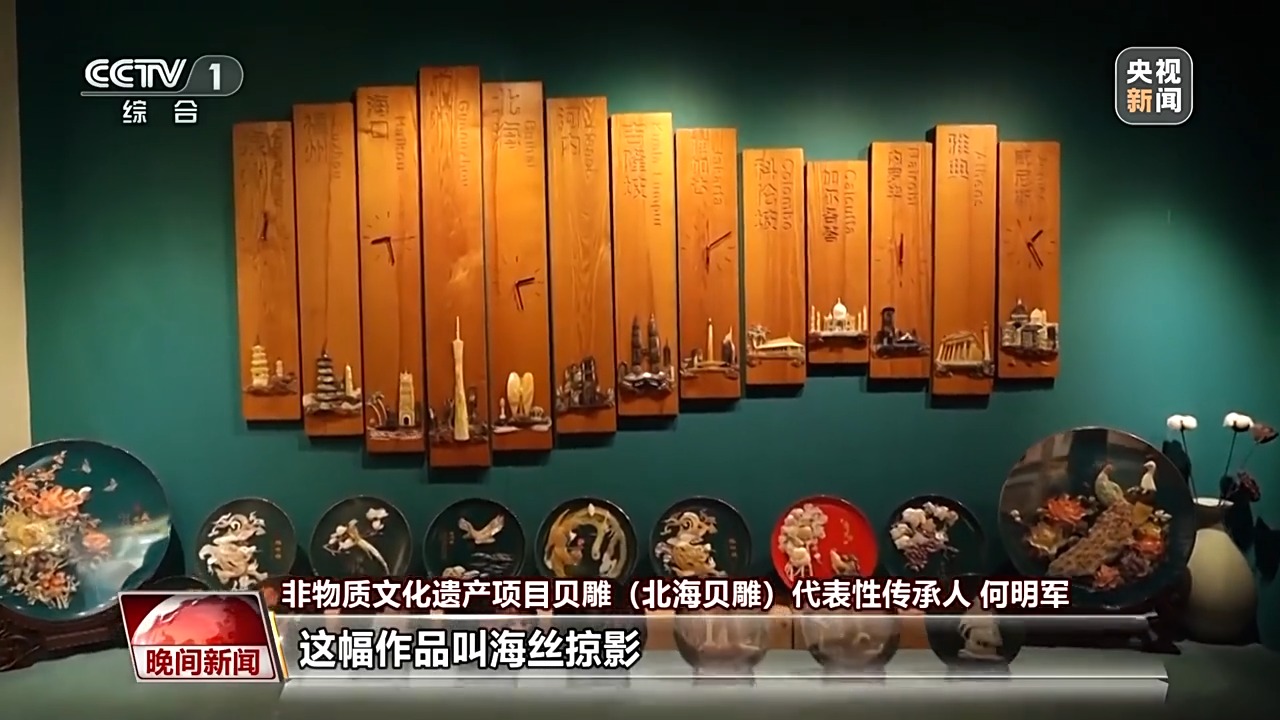 *非物質文化遺產項目貝雕(北海貝雕)代表性傳承人 何明軍:*這幅作品叫海絲掠影,總共有13塊國家的城市地標剪影組成。從我們北海出去的話,經過了東南亞到非洲,最後到了威尼斯,這個作品我們用貝雕的形式來呈現的話,還是第一次。