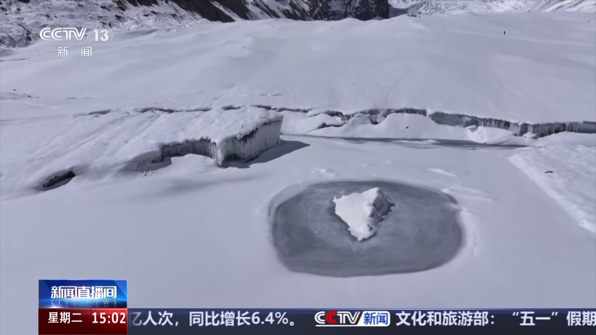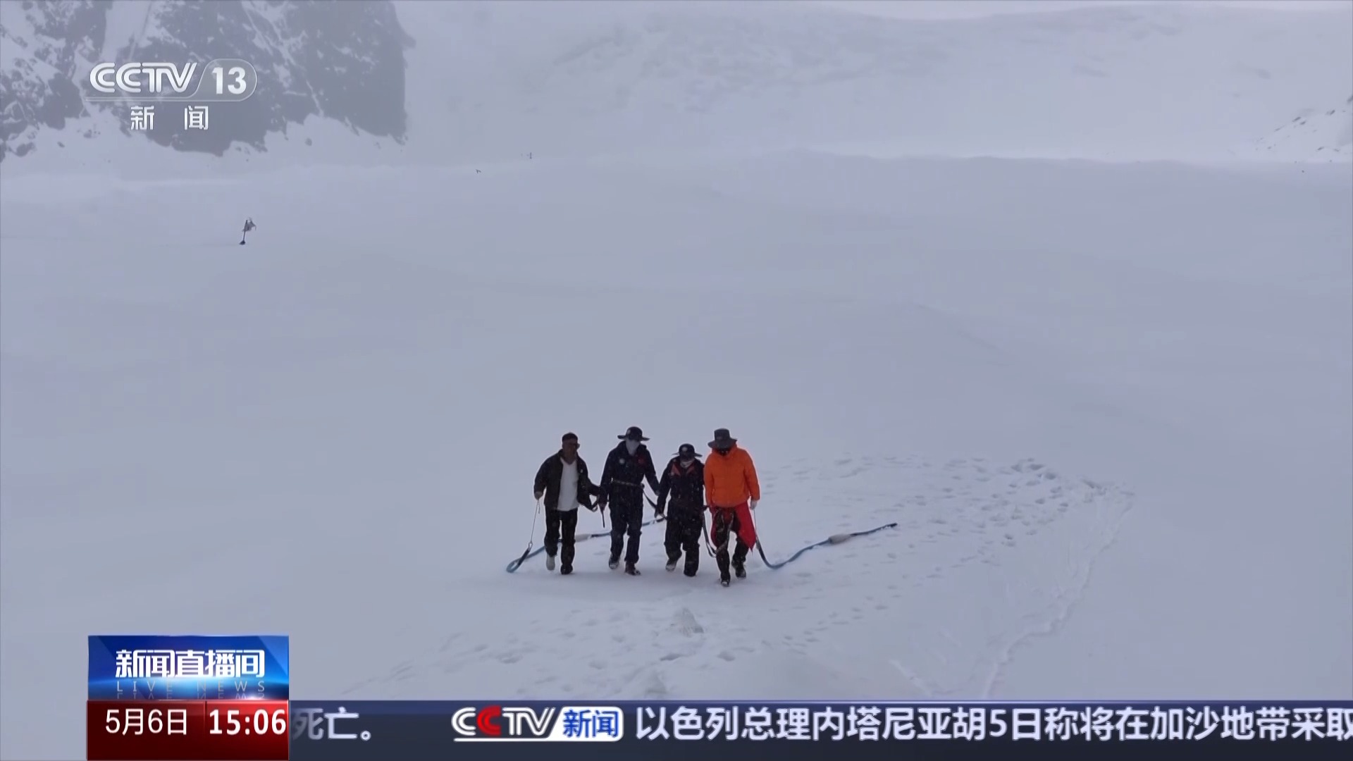 *總枱央視記者 楊瀟:*山下那個小木屋是我們剛才出發的位置,那個位置大概是4600多米的海拔,我們的直播點的海拔是4745米。100多米的高程,我們爬上來,大概需要40分鐘的時間,而且相比之前我們踩點,今天的難度應該是最大的,因為昨天晚上整個冰川上面下雪了,我們從然烏鎮出發的時候,當地在下雨,那山上一直在下雪,包括現在還在飄小雪花,我們在上去的時候還必須小心,因為我們有嚮導,他會領着我們以最安全的路線前進,在這個雪底下是有冰縫和冰洞的,所以必須保證安全。每個人都要穿一個防滑設備,他們俗稱釘鞋,其實它很簡單,就是一個橡膠的鏈,上面綁着鐵釘,這個別看簡單,非常有用。順着直播點再往上爬七八十米,我們可以看到調查人員在做的工作,就是拖着兩根藍色的繩子,這個繩子其實叫探地雷達,非常先進的裝備,他們拖着繩子走上去,就能對腳下冰面的厚度進行探測。