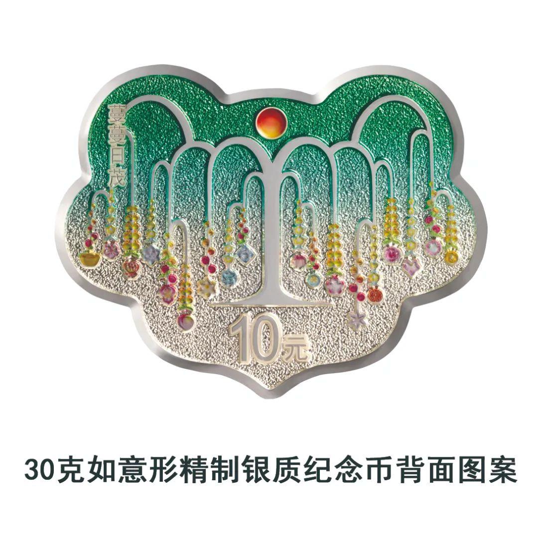 30克如意形銀質紀念幣為精製幣,含純銀30克,外接矩形36毫米×47毫米,面額10元,成色99.9%,最大發行量20000枚。