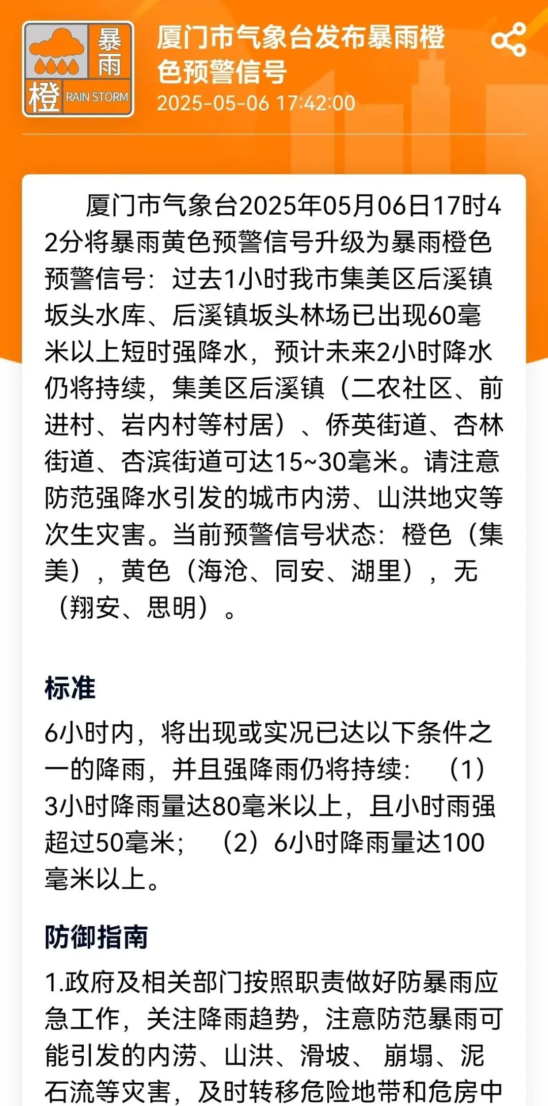 另據廈門市氣象台2025年05月06日17時40分發布降水實況:過去1小時(16:40-17:40)集美區後溪鎮坂頭水庫62.4毫米、集美區僑英街道樂海公園58.1毫米、集美區後溪鎮杏南中學57.2毫米、集美區後溪鎮坂頭林場50.1毫米、集美區杏濱街道前場村50.1毫米。
