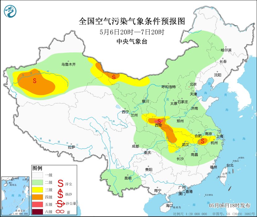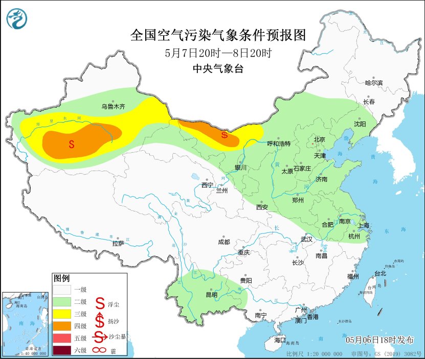 6日夜間至7日,內蒙古西北部、甘肅西部、新疆南部和東部等地的部分地區有揚沙或浮塵天氣。