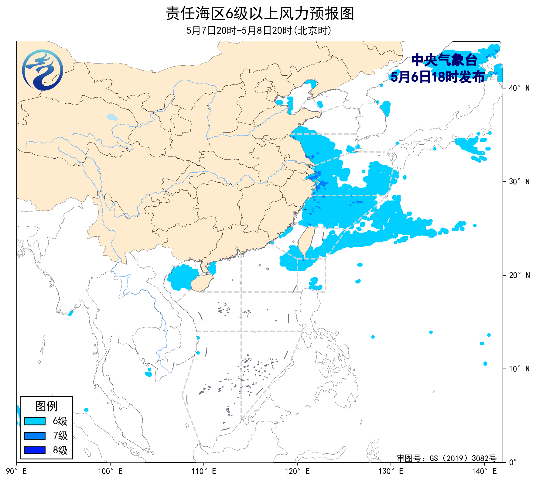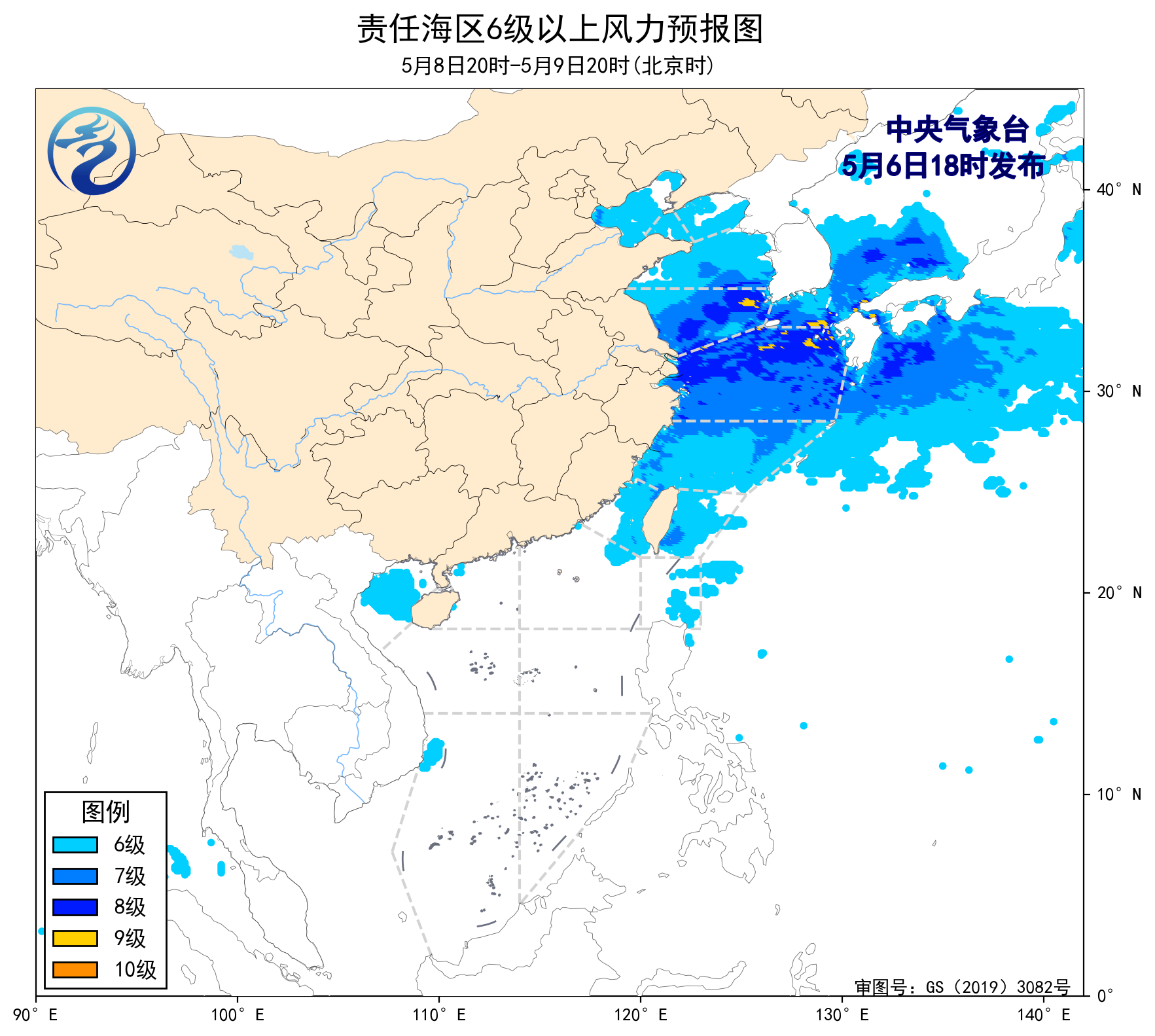 8日20時至9日20時,黃海南部海域、東海北部海域將有7~8級、陣風9級的偏東到東南風,黃海中部海域將有6~7級、陣風8級的東南風到偏東風,東海南部海域將有5~7級、陣風8級的東南風轉西南風,渤海將有4~6級、陣風7級的偏南轉偏東風,渤海海峽將有4~6級、陣風7級的東南風轉東北風,黃海北部海域將有4~6級、陣風7級的偏東到東北風,台灣海峽、台灣以東洋麪、北部灣將有4~6級、陣風7級的偏南到西南風。