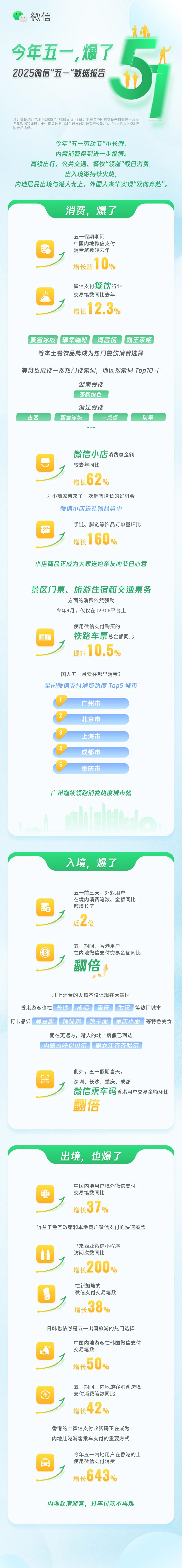 同時,外國人來華、港人北上同樣火熱。微信支付外卡數據顯示,今年“五一”假期前三天,外籍用户在境內消費筆數、金額同比都增長了近2倍。