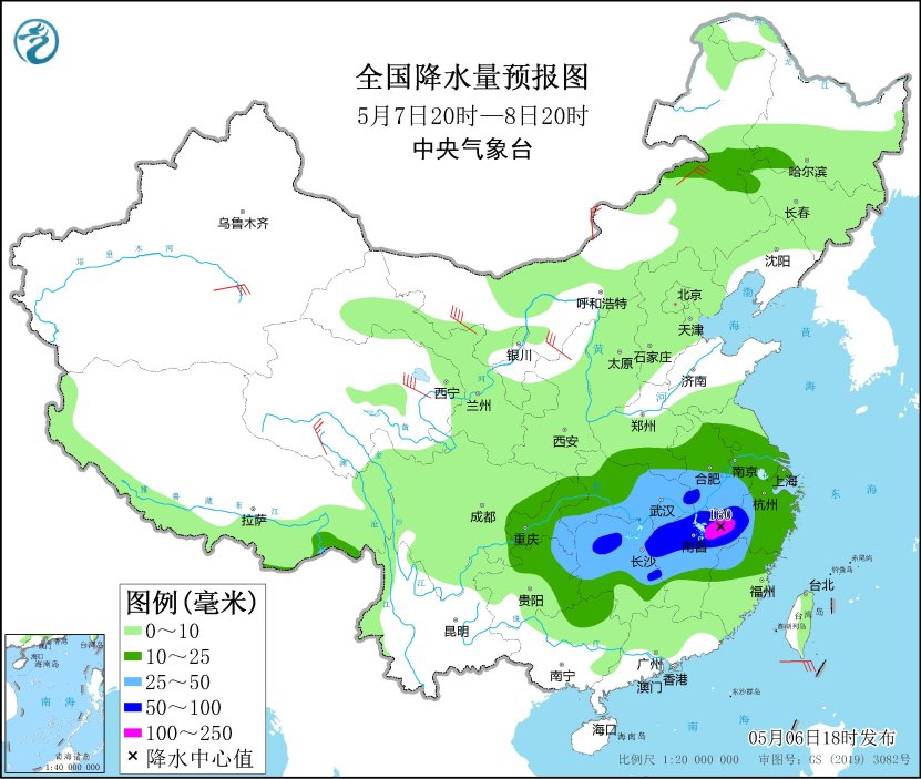 *5月7日20時至8日20時,*內蒙古東北部、黃淮西部、江淮大部、江漢、江南大部、西南地區東部等地部分地區有中到大雨,其中,湖南中北部、江西北部、浙江中部等地部分地區有暴雨或大暴雨(100~160毫米)。內蒙古中西部、新疆南疆盆地、青海東部和南部等地部分地區有4~6級風,其中,內蒙古西北部、青海東部等地部分地區有6~7級風(見圖2)。