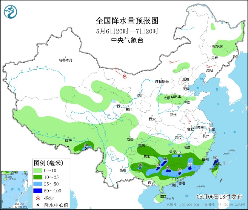 *5月6日20時至7日20時,*西藏東南部、江南南部、西南地區東南部、華南大部、台灣島大部等地部分地區有中到大雨,其中,廣西東北部、廣東中北部、台灣島北部等地局地有暴雨(50~80毫米)。內蒙古中部和西北部、遼寧中部、安徽北部等地部分地區有4~6級風(見圖1)。