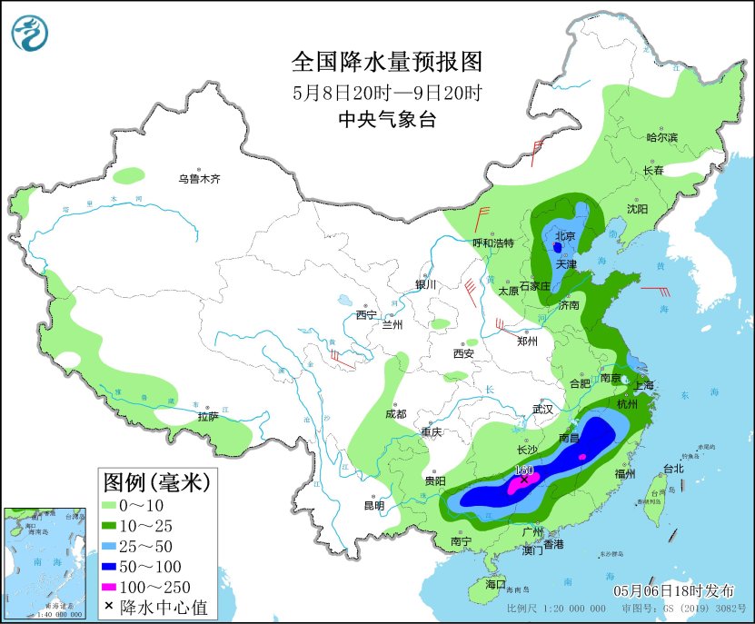 *5月8日20時至9日20時,*華北中東部、黃淮東部、江淮東部、江南中東部和南部、華南北部等地部分地區有中到大雨,其中,湖南南部、江西中南部和東北部、福建西北部、廣西東北部、廣東西北部、北京東南部等地部分地區有暴雨或大暴雨(100~160毫米)。內蒙古中東部、青海南部、陝西北部、河南西部等地部分地區有5~7級風(見圖3)。