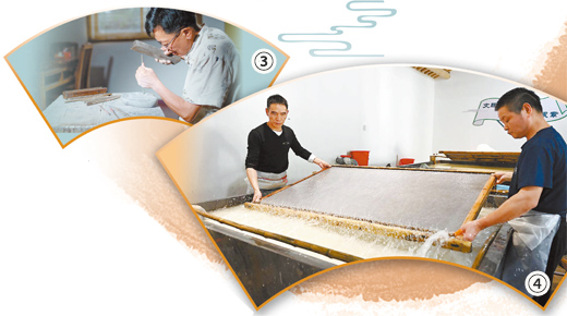 圖④:工人在宣紙生產車間進行撈紙作業。