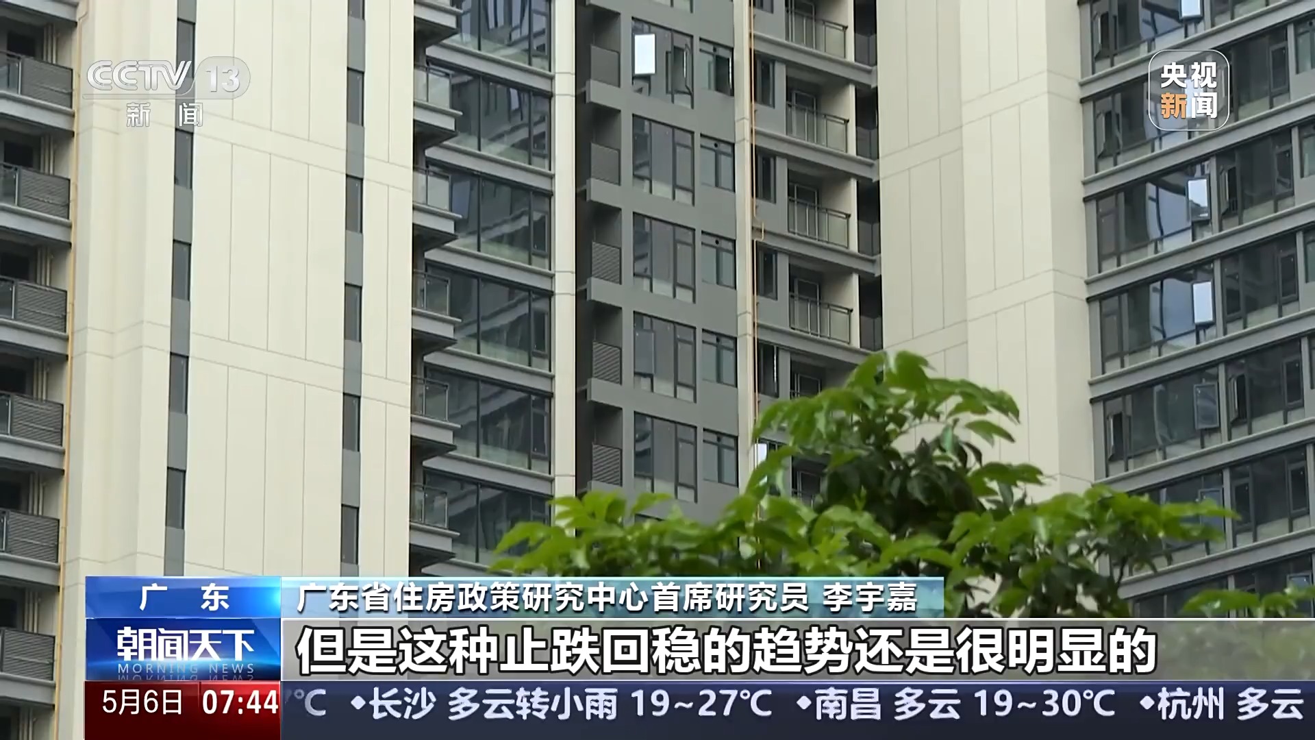 *廣東省住房政策研究中心首席研究員 李宇嘉:*重點城市新房、二手房交易量,連續兩個季度出現同比增長,儘管今年第一季度增長的幅度比去年第四季度的增長幅度有所下降,但是這種止跌回穩的趨勢還是很明顯的。