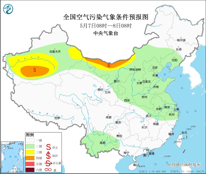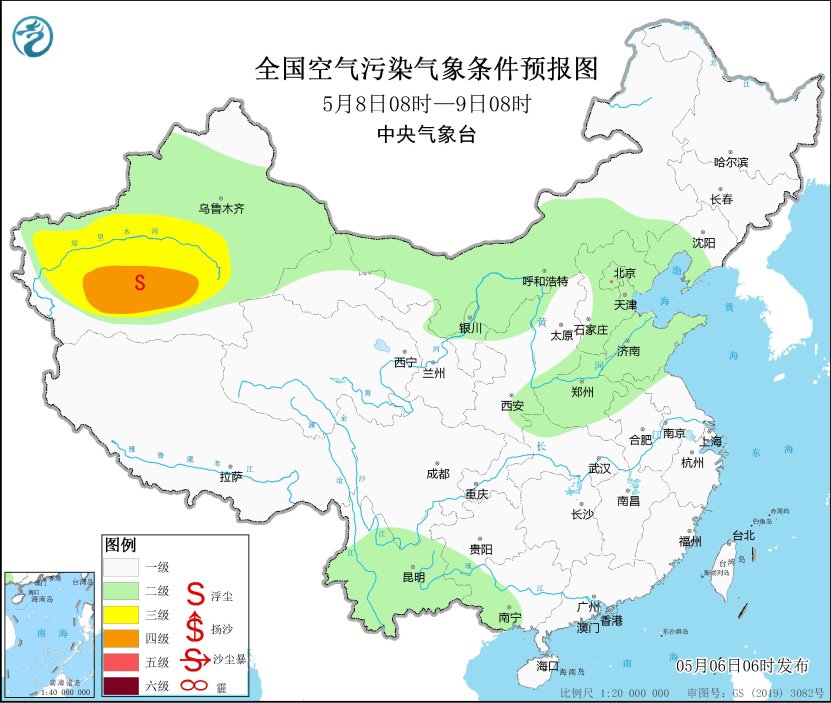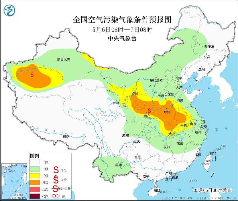 6日,新疆南疆盆地、甘肅東部、寧夏中部、陝西中部、河南南部和西部、湖北北部、安徽北部等地的部分地區有揚沙或浮塵天氣。中央氣象台於5月6日06時**繼續發佈沙塵暴藍色預警。