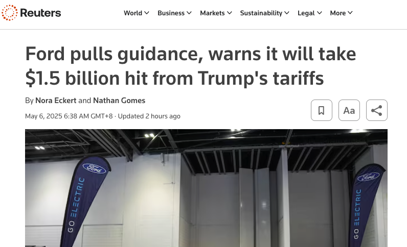 【環球網科技綜合報道】5月6日消息,據外媒路透社報道,美國汽車巨頭福特汽車公司公開披露,因美國現行及潛在關税政策帶來的供應鏈與市場成本壓力,該公司預計2025年將因關税因素額外損失15億美元利潤,並宣佈撤回三個月前發佈的全年業績預期。