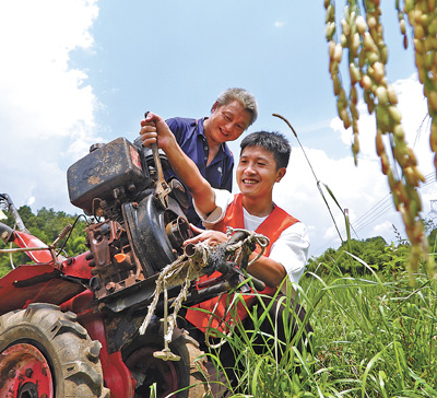 四川省達州市鐵佛村,駐村第一書記周靖涵(右)在幫助村民修理旋耕機。