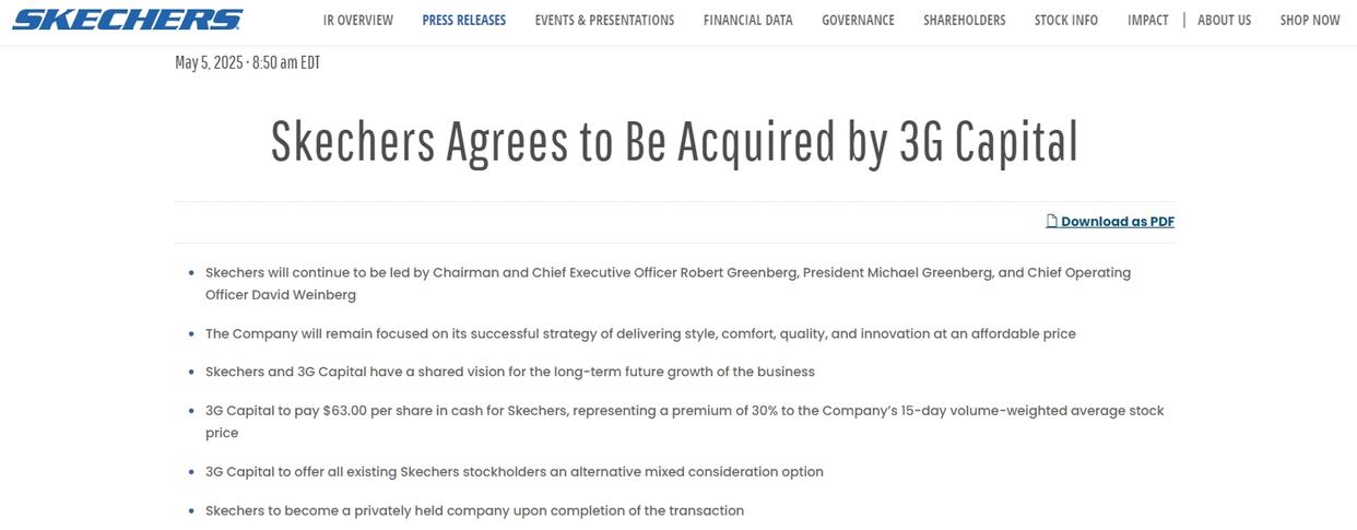 根據斯凱奇發佈的公告顯示,其已同意被全球投資公司3G資本收購,預計於今年第三季度完成交易,交易金額約94億美元。
