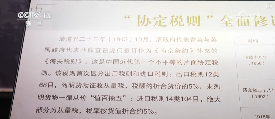 粵海關博物館講解服務隊陳曉旋介紹,從鴉片戰爭後到1929年,海關一直執行的是片面的協定税則,協定税則也就是我們的税則和税率都要經過外國人的同意和批准。反映了列強在經濟上對中國的侵略以及弱國無外交的現實情況。