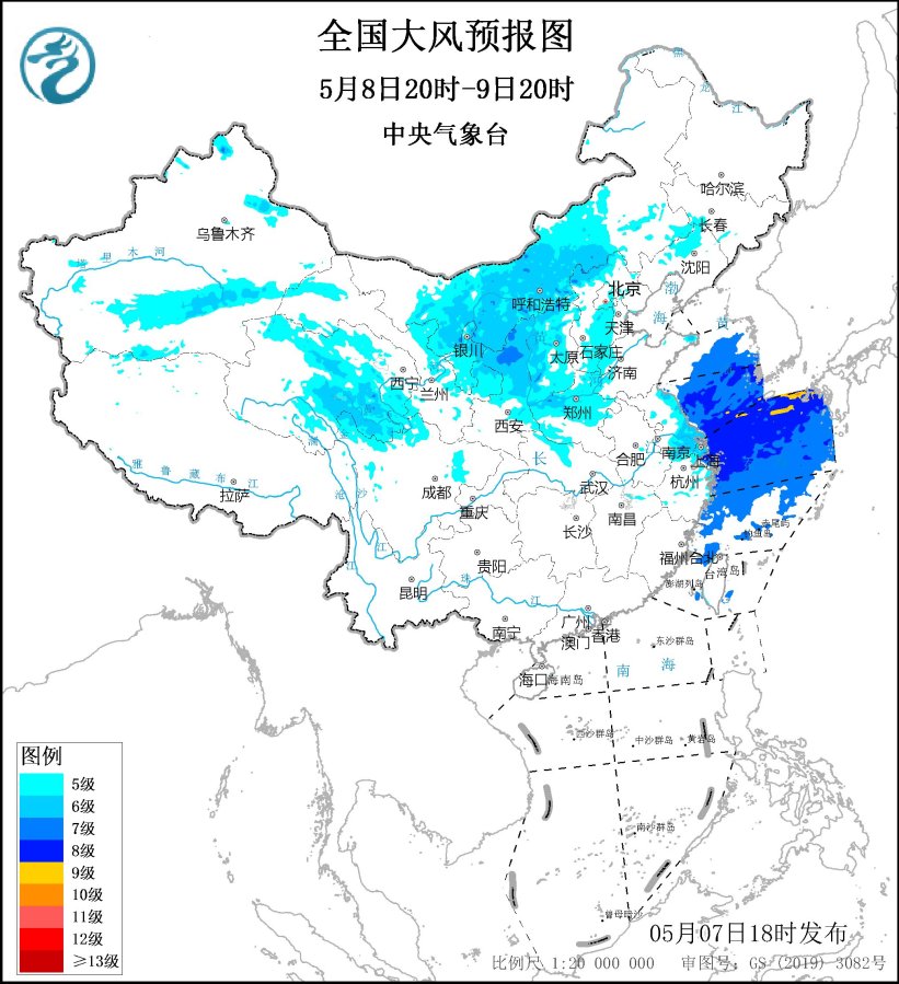 5月8日20時至9日20時,新疆南疆盆地、內蒙古中東部、青海東部、西北地區東部、華北西部、黃淮西部、江蘇、浙江等地部分地區有5~6級、陣風7~8級,其中,內蒙古中部、陝西北部等地的部分地區平均風力可達7級、陣風8~10級;黃海西南部海域、東海西部海域、台灣以東洋麪、巴士海峽將有7~8級、陣風9級的大風。