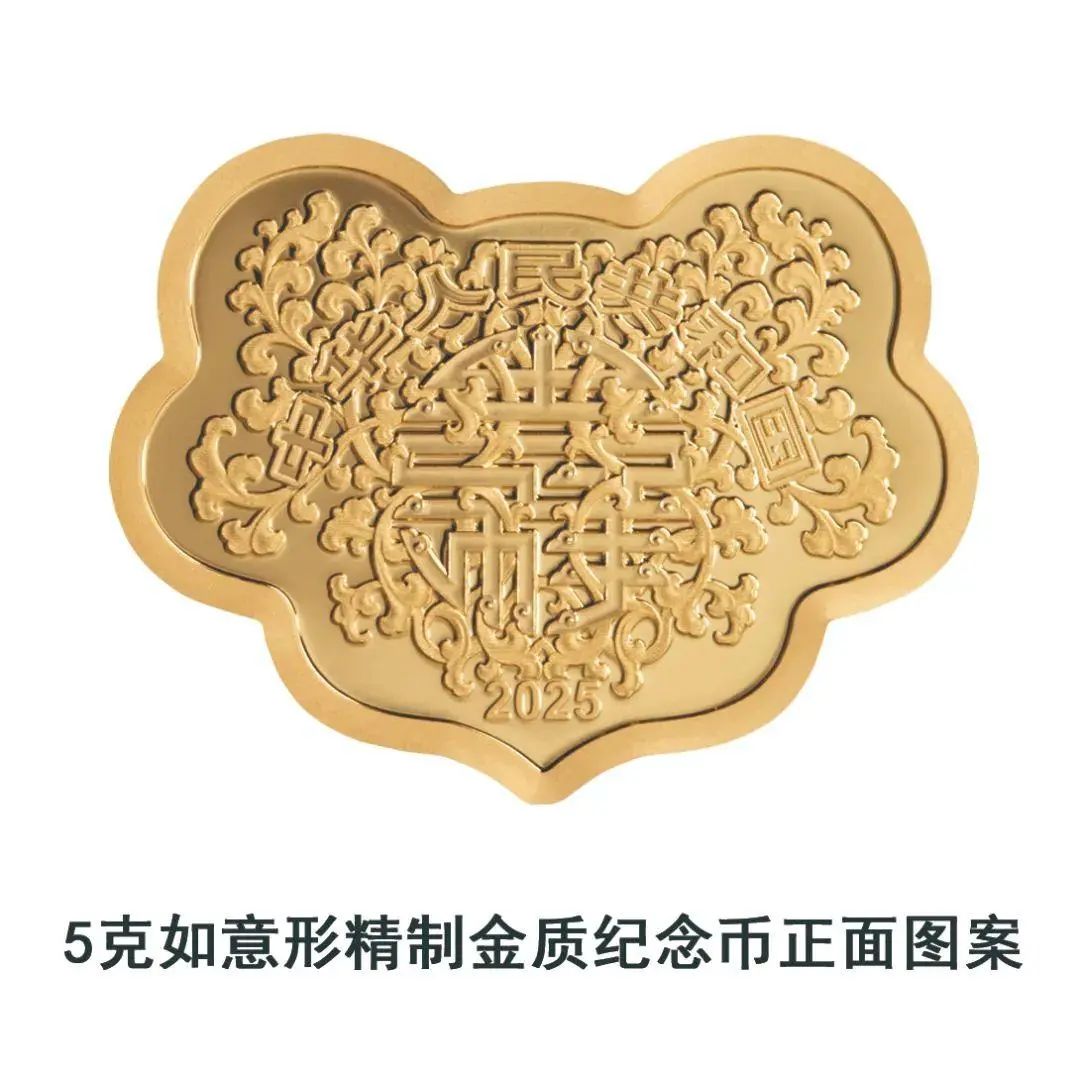 5克如意形金質紀念幣為精製幣,含純金5克,外接矩形18毫米×24毫米,面額80元,成色99.9%,最大發行量10000枚。