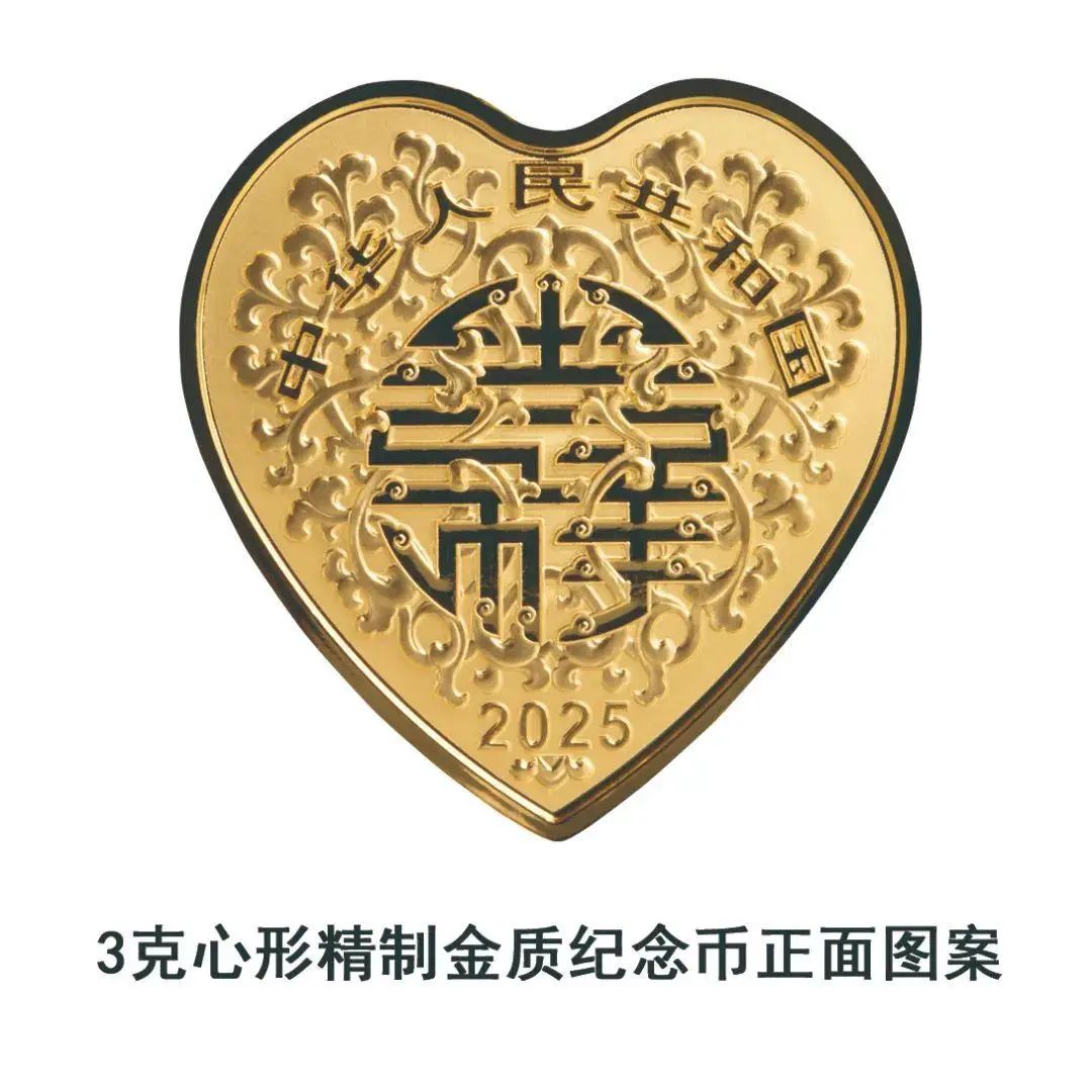 3克心形金質“永結同心”紀念幣背面圖案為吉祥鳥、吉祥花卉等裝飾組合設計,並刊“永結同心”字樣及面額。