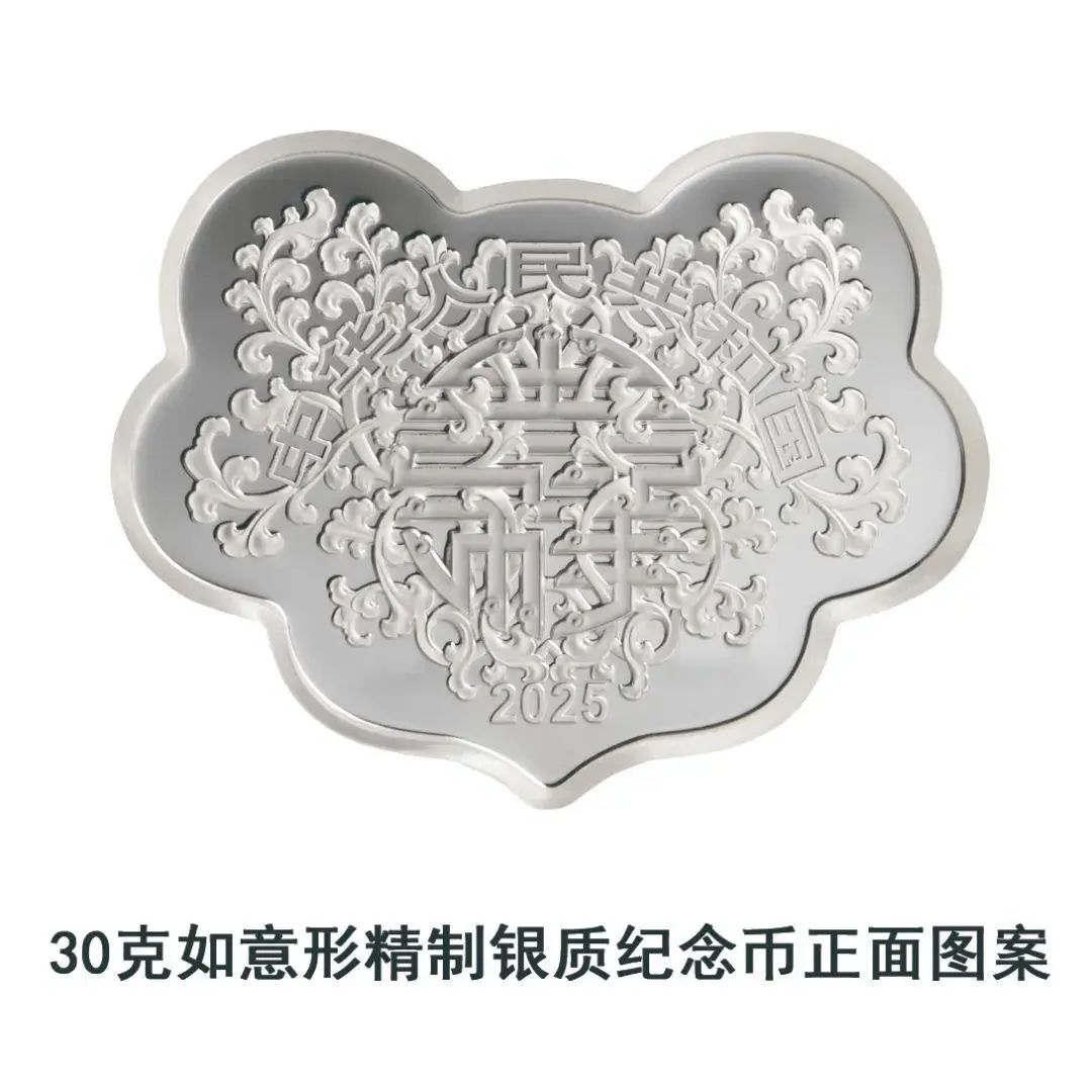 30克如意形銀質紀念幣為精製幣,含純銀30克,外接矩形36毫米×47毫米,面額10元,成色99.9%,最大發行量20000枚。