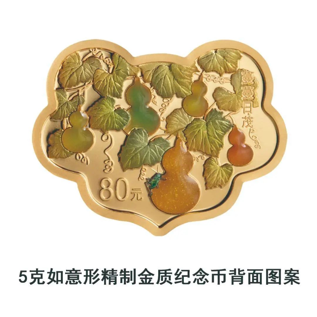 5克如意形金質“蔓蔓日茂”紀念幣背面圖案為葫蘆、藤蔓、蟈蟈等裝飾組合設計,並刊“蔓蔓日茂”字樣及面額。