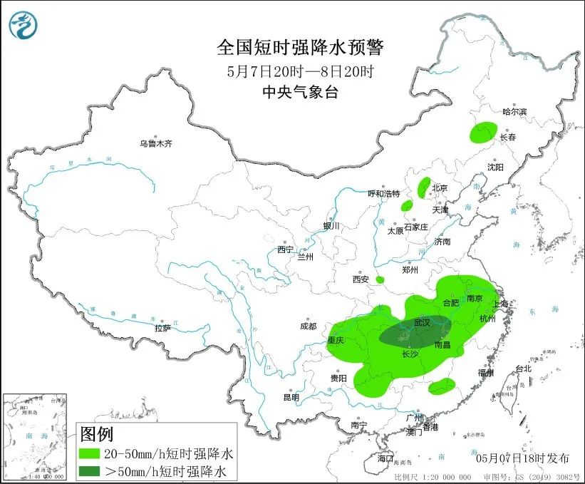 預計,5月7日20時至8日20時,黃淮西部、江淮大部、江漢大部、江南北部和西部、重慶中南部、貴州東部、廣西北部、廣東北部等地部分地區有大到暴雨,其中,湖北東部和南部、湖南東北部等地局地有大暴雨(100至130毫米)。上述部分地區伴有短時強降水(最大小時降雨量20至50毫米,局地可超過80毫米),局地有雷暴大風等強對流天氣。