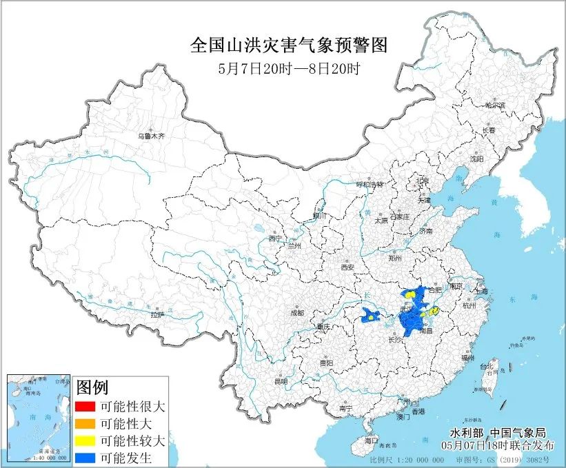 預計,5月7日20時至8日20時,安徽西部和南部、江西北部、河南南部、湖北東部和南部、湖南北部等地部分地區可能發生山洪災害(藍色預警),其中,安徽南部、江西北部、河南南部、湖北東部、湖南北部局地發生山洪災害可能性較大(黃色預警)。其他地區也可能因局地短歷時強降水引發山洪災害,請各地注意做好即時監測、防汛預警和轉移避險等防範工作。