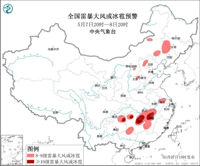 預計5月7日20時至8日20時,內蒙古東部、吉林西部、遼寧西北部、河北北部、北京西北部山區、山西北部和東部、安徽南部、湖北東南部、重慶東南部、貴州東北部、湖南中北部和西南部、江西等地的部分地區將有8級以上雷暴大風或冰雹天氣,其中,湖南北部、江西北部、重慶東南部、貴州東北部等地的部分地區將有10級以上雷暴大風,最大風力可達11級以上,江西北部等地局地不排除出現龍捲的可能性。