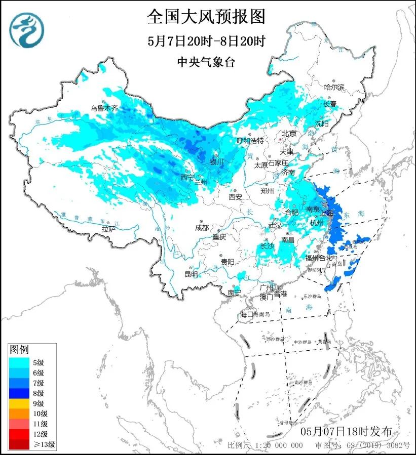 預計,5月7日20時至8日20時,新疆東部和南疆盆地、內蒙古、青海、甘肅西部、遼寧西部、安徽、江蘇、上海、浙江等地部分地區有5至6級、陣風7至8級,其中,新疆東部、內蒙古西部、青海北部等地的部分地區平均風力可達7級、陣風8至10級;黃海西南部海域、東海西部海域、台灣以東洋麪、巴士海峽將有7至8級、陣風9級的大風。