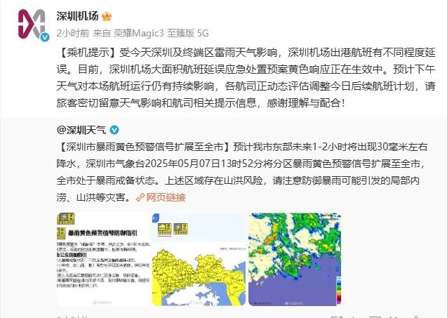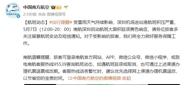 針對天氣影響,南方航空、深圳航空等航司今日也發佈出行提示,並啓動相應航延保障響應。