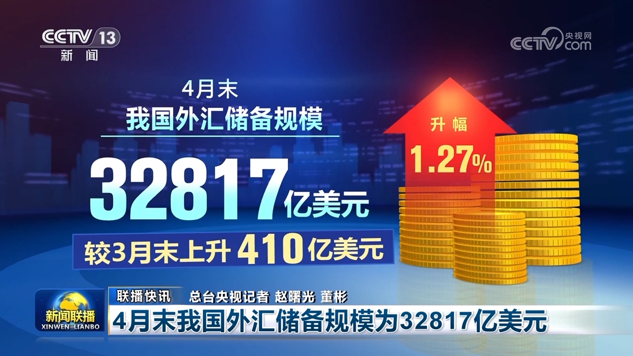 國家外匯管理局最新數據顯示,4月末,我國外匯儲備規模為32817億美元,較3月末上升410億美元,升幅為1.27%,我國經濟呈現向好態勢,經濟發展韌性強、活力足,有利於外匯儲備規模保持基本穩定。