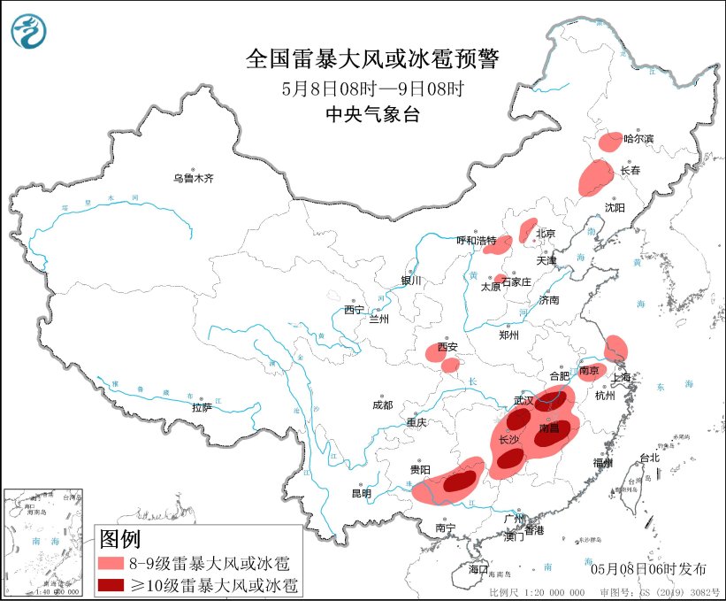 預計5月8日08時至9日08時,吉林西部、內蒙古東部、山西北部、河北北部、北京西部山區、陝西南部、江蘇南部、安徽南部、湖北東部、湖南東部和西南部、江西中北部、廣西北部等地的部分地區將有8級以上雷暴大風或冰雹天氣,其中,安徽西南部、湖北東部、湖南東部、江西中北部、廣西東北部等地的部分地區將有10級以上雷暴大風,最大風力可達11級以上,江西北部等地局地不排除出現龍捲的可能性;吉林西北部、河北東部和南部、山西西北部、河南南部、安徽中南部、江蘇中南部、浙江中西部、湖北中東部、福建西北部、江西、湖南、貴州東南部、廣西中北部、廣東西北部等地的部分地區將有小時雨量大於20毫米的短時強降水天氣,其中,湖南中南部、江西中北部、浙江西部、福建西北部、廣西北部等地的部分地區小時雨量大於50毫米,最大可達80毫米以上。
