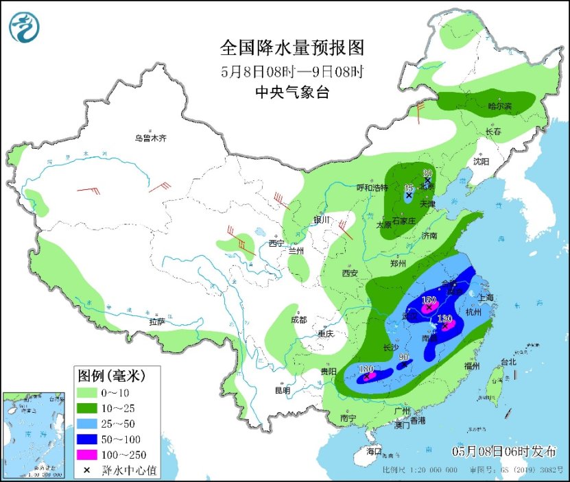預計今天白天至夜間,江淮大部、江漢東部、江南西南部和中東部、華南北部以及華北東北部等地部分地區有大到暴雨,其中,安徽西南部、湖北東部、江西東北部、浙江西部、廣西北部等局地有大暴雨;上述部分地區伴有短時強降水、8級以上雷暴大風或冰雹天氣等強對流天氣,其中,安徽西南部、湖北東部、湖南東部、江西中北部、廣西東北部等局地將有10級以上雷暴大風,最大風力可達11級以上,江西北部等地局地不排除出現龍捲的可能性。