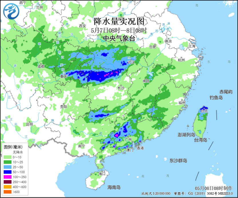 氣象監測顯示,昨日,重慶東部、湖北西南部、湖南西北部、廣西東北部、廣東中西部及台灣島北部等地部分地區出現大到暴雨,重慶彭水、湖北恩施、湖南張家界、廣東肇慶和江門等局地大暴雨(100~192毫米)。