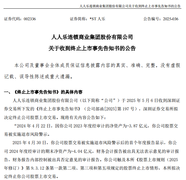 由於觸及多項退市指標,*ST人樂也難逃被終止上市的命運。