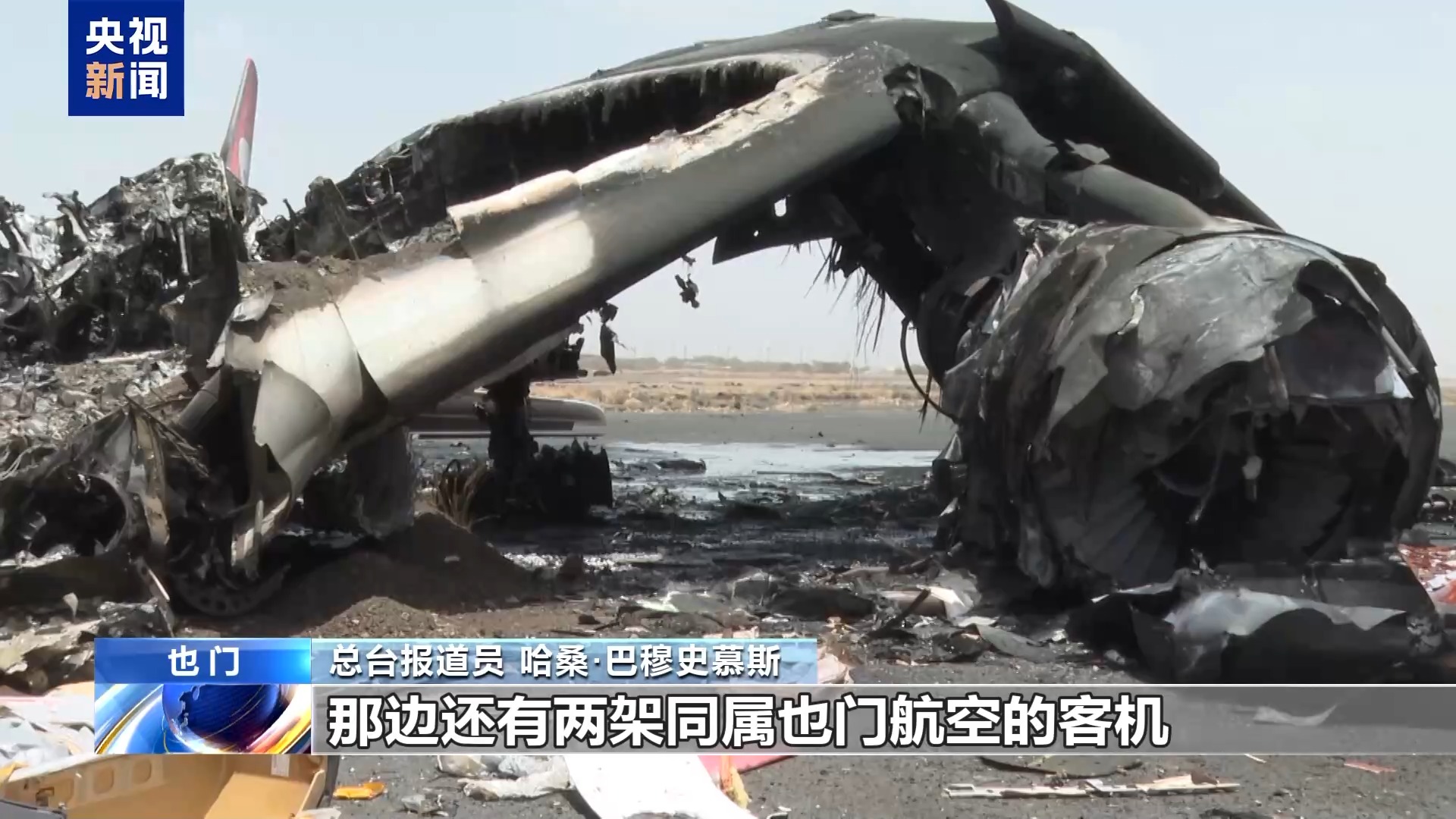 *總枱報道員 哈桑·巴穆史慕斯:*正如你們現在看到的,機場跑道被專門針對掩體的導彈摧毀,還有多架民航飛機也被摧毀。這些飛機曾經是老人、病人、僑民賴以進行國際旅行的工具。除我身後這架客機外,那邊還有兩架同屬也門航空的客機也被摧毀了。