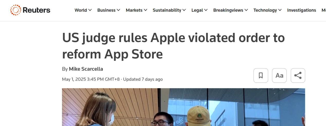 此前,美國聯邦法官Yvonne Gonzalez Rogers於5月1日作出裁定,認定蘋果公司違反了2021年法院命令,未能在App Store中開放外部支付選項,構成反競爭行為。法官指出,蘋果不僅未能遵守命令,反而設計新的反競爭措施,意圖維持其高利潤的30%應用內購買抽傭模式。儘管蘋果隨後允許開發者引導用户通過網頁完成應用內購買交易,但仍強收27%的佣金。