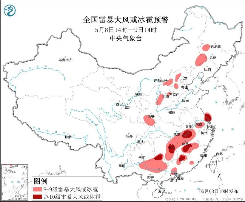 預計5月8日14時至9日14時,華北、東北地區、江漢東部、江淮、江南、華南等地的部分地區將有8級以上雷暴大風或冰雹天氣,其中,安徽南部、江蘇東南部、湖南東部、江西中北部、廣西北部、廣東西北部等地的部分地區將有10級以上雷暴大風,最大風力可達11級以上,江西中北部等地局地不排除出現龍捲的可能;華北、江漢東部、江淮、江南、華南等地的部分地區將有小時雨量大於20毫米的短時強降水天氣,其中,河北中部、江蘇中部、湖南東南部、江西中部、浙江西南部、福建西北部、廣西北部、廣東等地的部分地區小時雨量大於50毫米,最大可達80毫米以上。