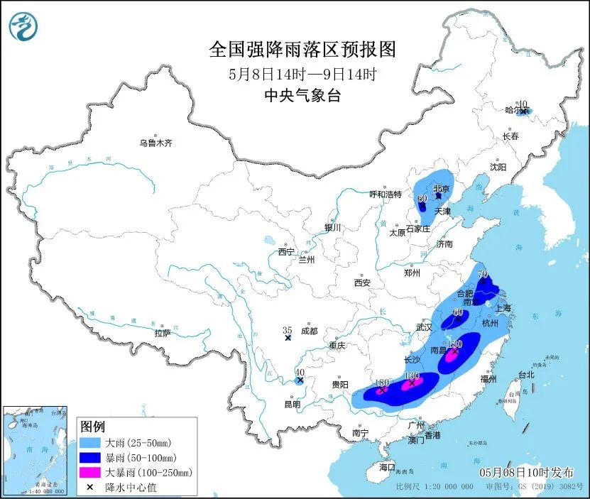 預計5月8日14時至9日14時,江淮南部、江南西南部和中東部、華南北部以及華北中北部等地部分地區有大到暴雨,其中,江西東部、湖南南部、廣西北部等地部分地區有大暴雨。上述部分地區伴有短時強降水,局地有雷暴大風冰雹等強對流天氣。