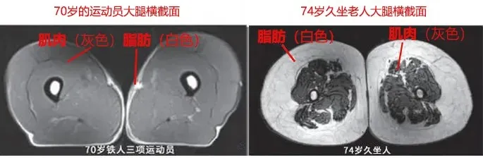可以看出,堅持運動的人大腿肌肉含量明顯更多,皮下脂肪更少;久坐的人與之相比,大腿肌肉含量明顯流失很多,皮下脂肪更多。