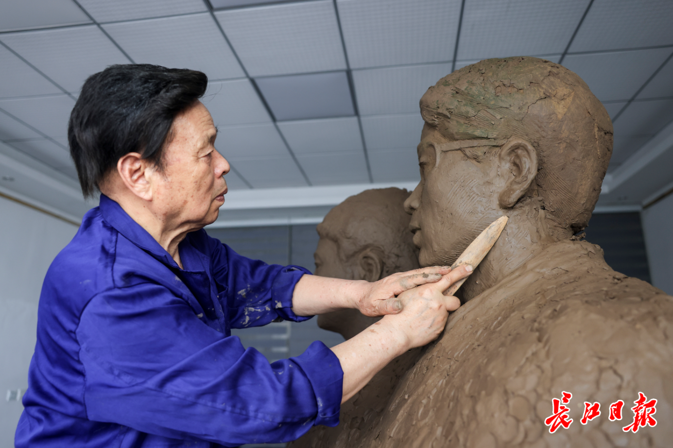 5月7日,在武漢鐵路職業技術學院徐家棚校區舊址實訓樓,70歲的陳德新手持泥塑刀一邊拍打泥塑一邊澆水。“拍打可確保作品的穩定性和耐久性,澆水可防止泥塑作品開裂。”