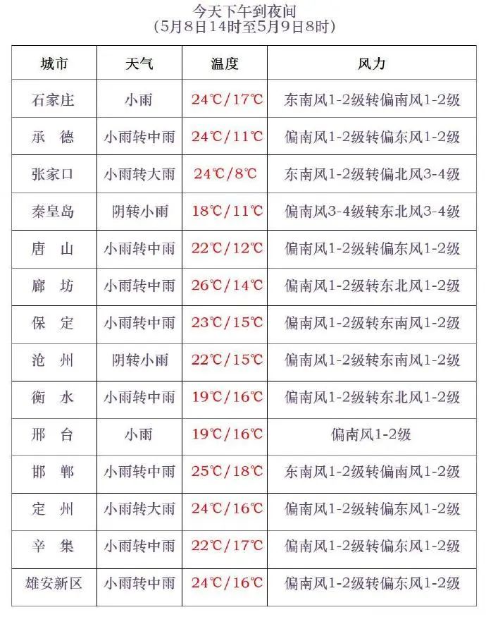 今天下午到夜間,全省陰,張家口北部、承德北部有小雨轉雨夾雪或小到中雪;其他地區有小到中雨,局部有大雨,降雨時局地伴有雷電、短時強降水、短時大風等強對流天氣。最高氣温,張家口北部、承德北部16~20℃,其他地區21~26℃。最低氣温,張家口西部和北部、承德、秦皇島北部1~10℃,其他地區11~18℃。