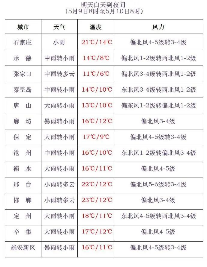明天白天,全省陰,張家口、承德北部、石家莊西部、邢台西部、邯鄲西部有小到中雨,其中壩上地區和張家口南部高海拔山區有中到大雪,局地有暴雪;其他地區有中到大雨,其中保定、雄安新區、廊坊、滄州西部局地有暴雨,降雨時局地伴有雷電、短時強降水、短時大風等強對流天氣。