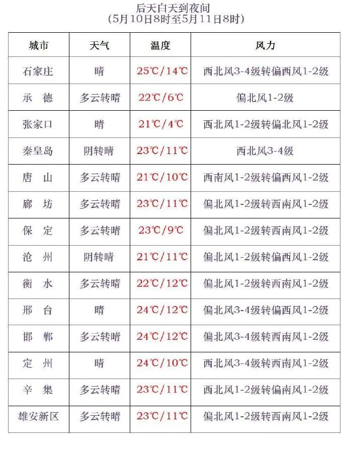 明天夜間到10日,承德南部、唐山、秦皇島、保定東部、廊坊、雄安新區、石家莊中東部、滄州、衡水、邢台東部、邯鄲東部陰有小到中雨轉多雲,其他地區多雲轉晴。