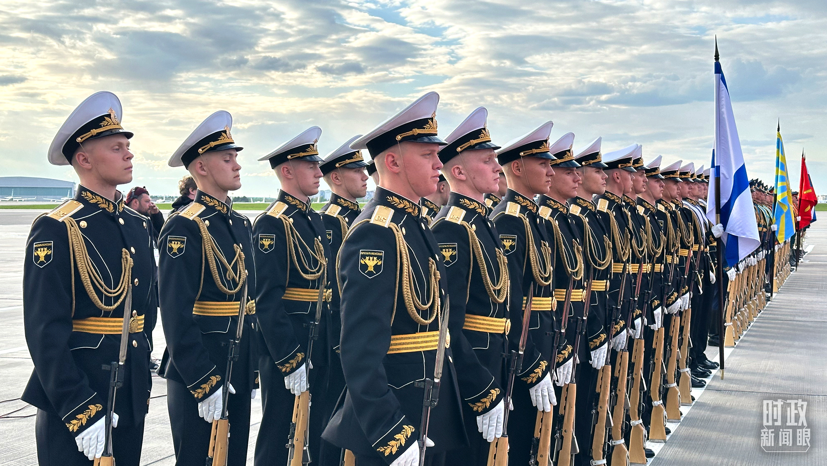 俄方在機場舉行隆重迎接儀式。軍樂團奏中俄兩國國歌。習主席檢閲儀仗隊並觀看分列式。