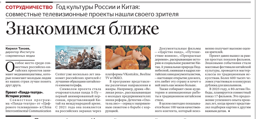 2025年為紀念世界反法西斯戰爭勝利80週年,雙方計劃聯合展映17部影片。這延續了每逢重要紀念日推出精選影視節目的傳統,此前已成功策劃多場主題特別放映活動。(作者:基里爾·塔納耶夫 俄羅斯現代媒體研究所所長)