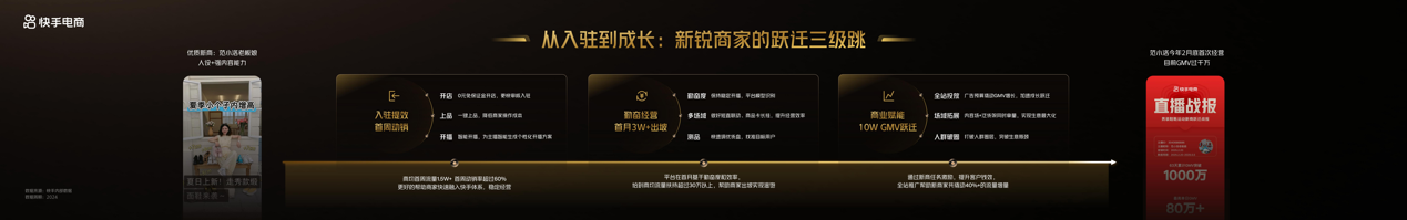 在全域經營的佈局中,內容場是關鍵一環。快手電商針對新商家和成長型商家制定了不同激勵政策。新手商家可參與新商冷啓計劃,獲得首播90天內的定向扶持。同時,新鋭商家長效經營方法論提出“三階躍遷模型”,從入駐提效到商業賦能,助力商家逐步實現GMV增長,構建全域增長閉環。鞋靴主播範小洛老闆娘就是成功案例,入駐3個月累計GMV超千萬,短視頻引流成交佔比超3成,投放ROI穩定在30左右。