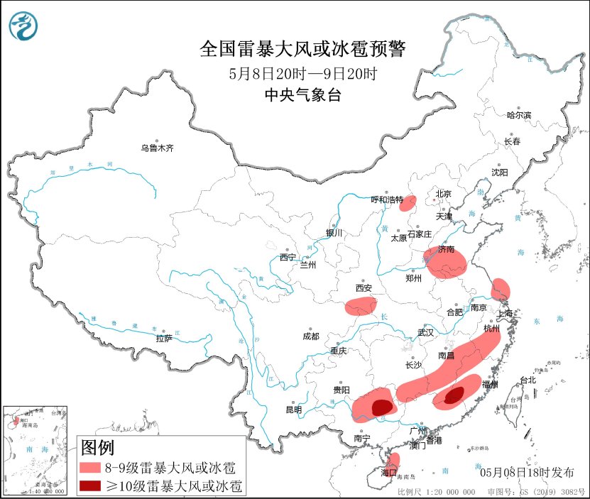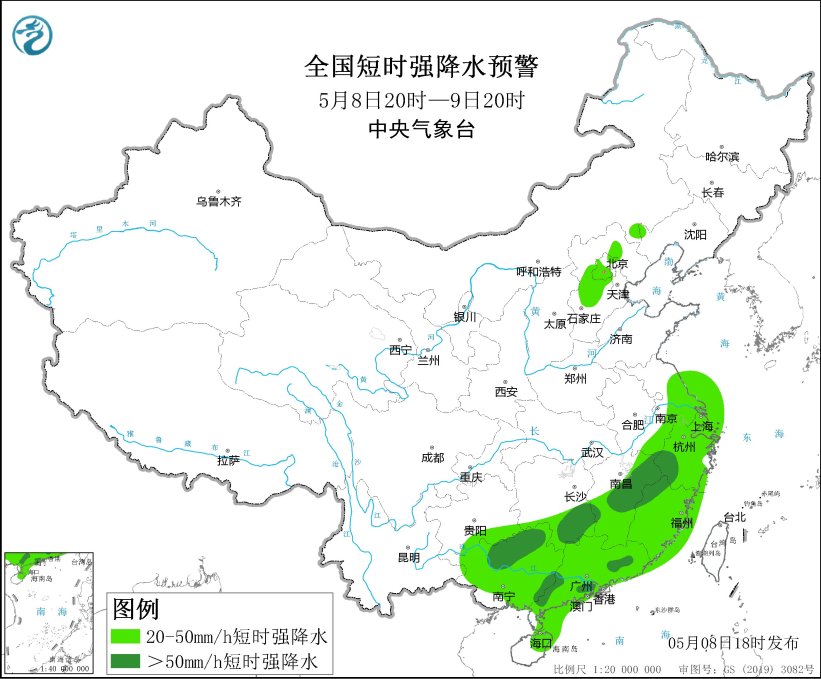 預計5月8日20時至9日20時,華北北部、黃淮中部、江淮東部、江南中東部、華南北部等地的部分地區將有8級以上雷暴大風或冰雹天氣,其中,福建西南部、廣西東北部、廣東東北部等地的部分地區將有10級以上雷暴大風,最大風力可達11級以上,廣西東北部等地局地不排除出現龍捲的可能;華北中部偏東地區、江淮東部、江南中東部、華南等地的部分地區將有小時雨量大於20毫米的短時強降水天氣,其中,湖南南部、江西中北部、浙江西南部、福建西北部、廣西北部、廣東中南部等地的部分地區小時雨量大於50毫米,最大可達80毫米以上。