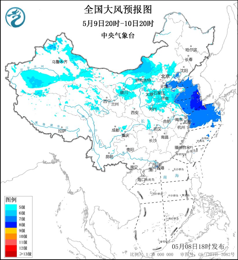 預計,5月8日20時至9日20時,新疆南疆盆地、內蒙古、青海、甘肅東部、寧夏、陝西中部和北部、山西、河北南部和西北部、北京、遼寧北部、吉林中部、河南北部、江蘇大部等地部分地區有5~6級、陣風7~8級,其中,內蒙古西部、青海、甘肅東部、寧夏、陝西北部等地的部分地區平均風力可達7級以上,陣風8~10級;黃海中部和南部海域、東海北部和西南部海域將有7~8級、陣風9~10級的大風,其中黃海南部和東海北部部分海域將有9級、陣風10~11級大風。
