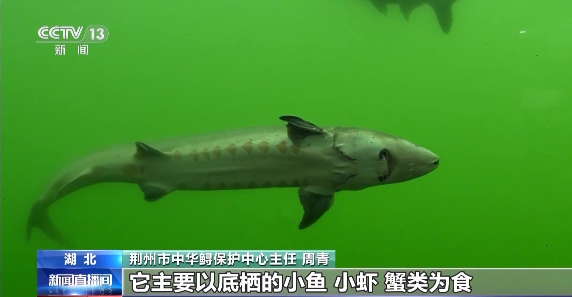 *荊州市中華鱘保護中心主任 周青:*中華鱘是底棲魚類,也是江海洄游的魚類,它們的嘴巴是下位的,主要以底棲的小魚、小蝦、蟹類為食。它們貼着邊邊遊,主要就是為了覓食方便。