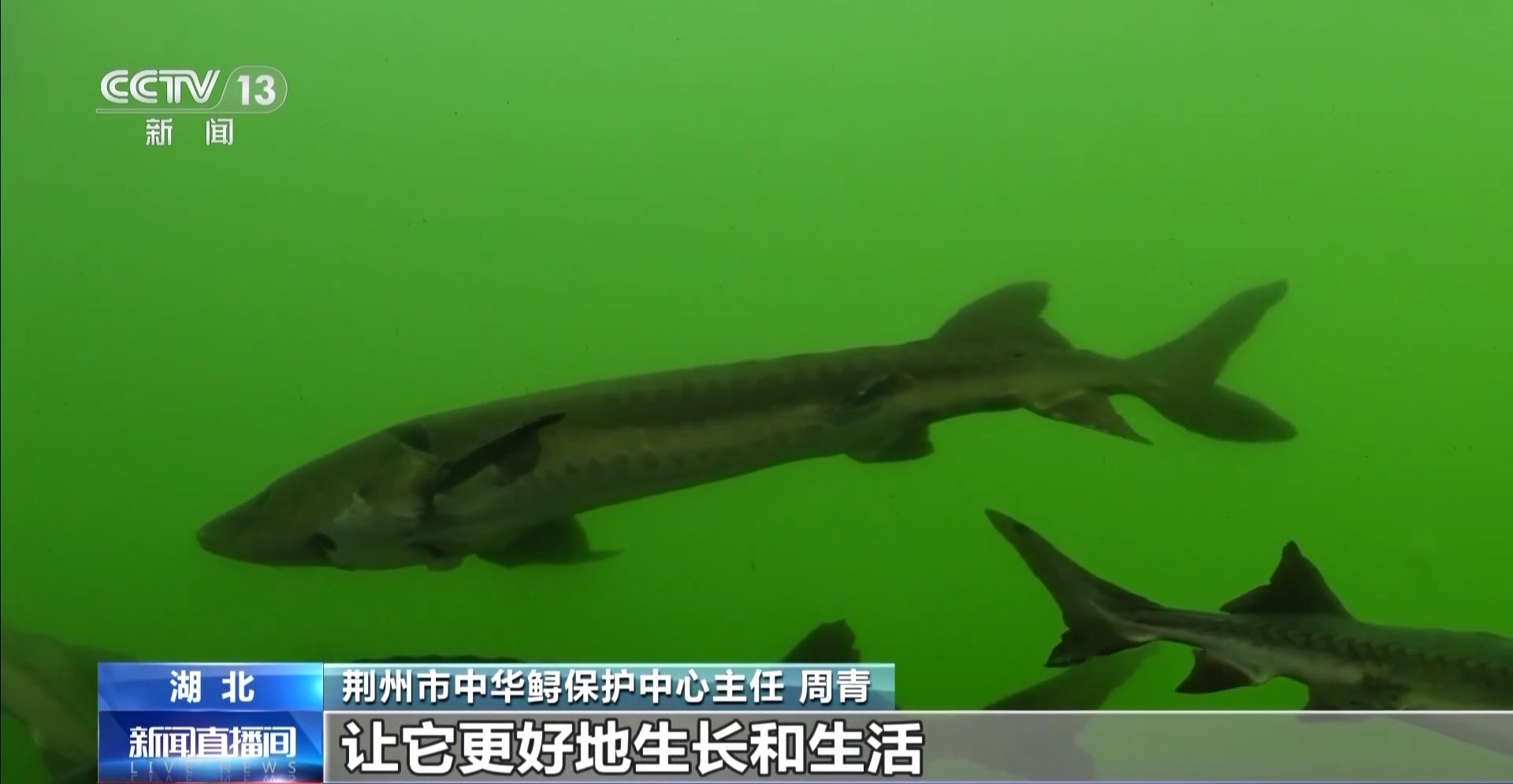 *荊州市中華鱘保護中心主任 周青:*子一代的中華鱘,它們的爸爸媽媽是長江裏面野生的中華鱘,通過人工繁殖產生的後代就稱為子一代。中華鱘的性成熟時間平均在15歲左右,我們給它們營造了更大的空間,更好模仿長江裏野生的環境,讓它們更好地生長和生活。