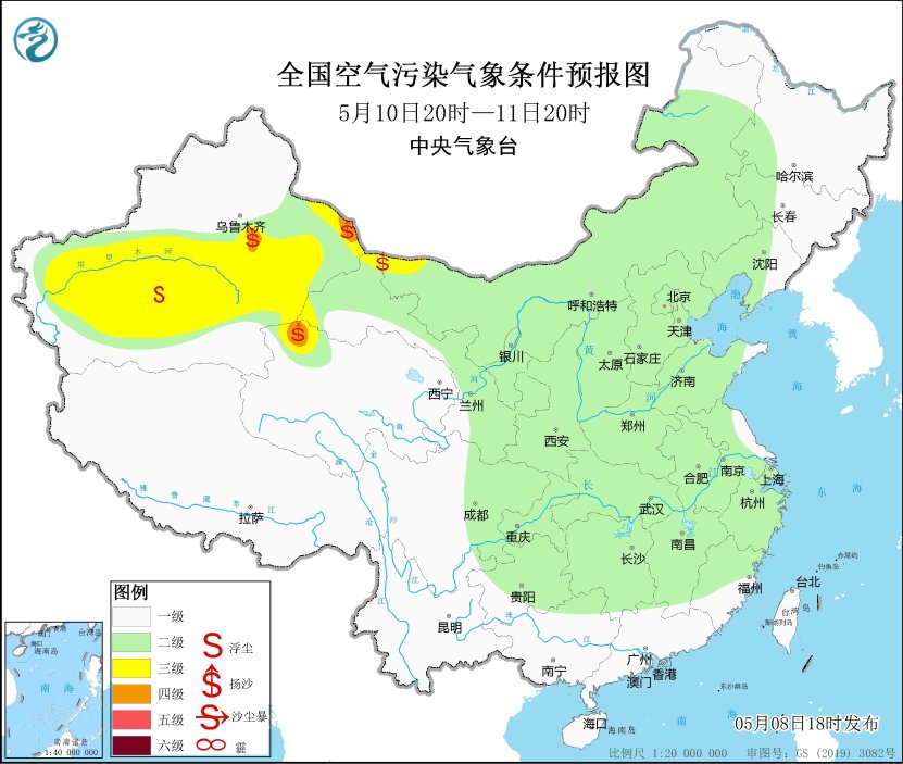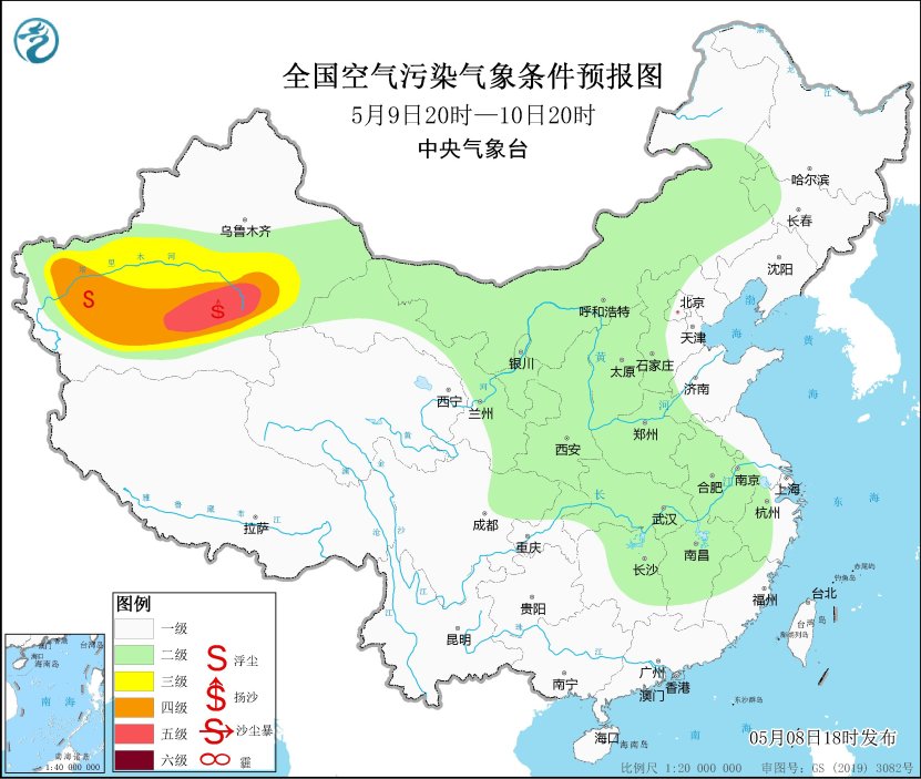 8日夜間至9日,新疆南疆盆地、內蒙古西部、甘肅中東部、青海東部、陝西北部等地的部分地區有揚沙或浮塵天氣,其中,新疆南疆盆地局地有沙塵暴或強沙塵暴。11日至13日,新疆東部和南疆盆地、內蒙古西部、甘肅西部、青海北部等地的部分地區有揚沙或浮塵天氣。