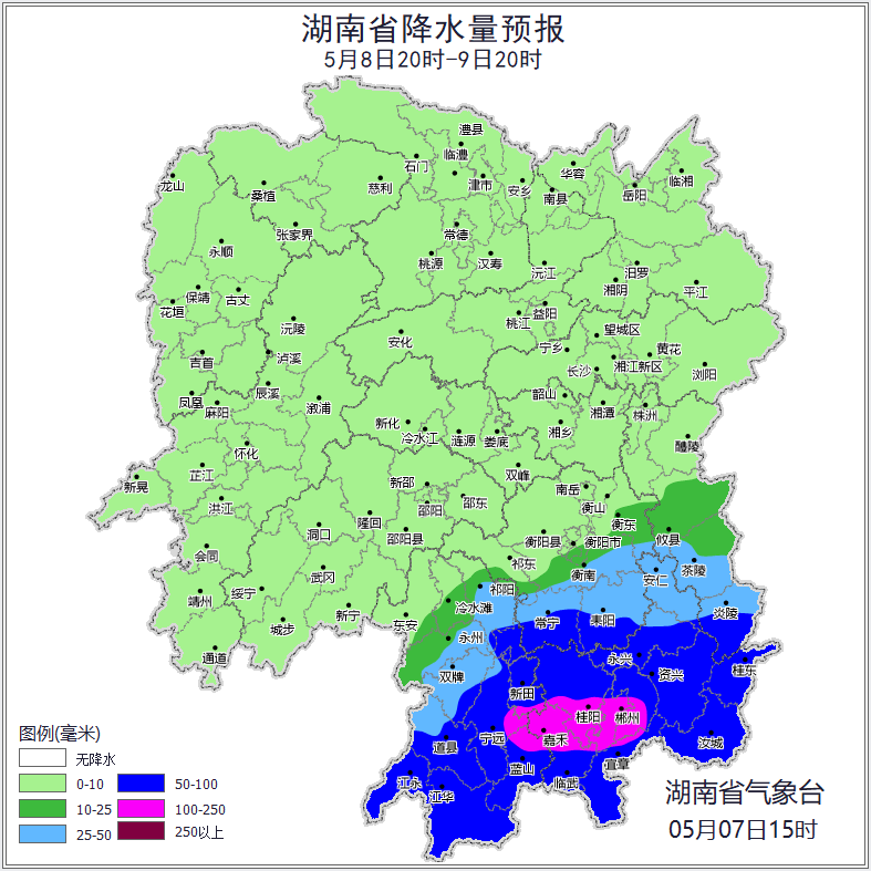 *8日晚上至9日白天,*湘東南陰天有大到暴雨,其中永州(新田、藍山、寧遠)、郴州(市區、桂陽、嘉禾、臨武、宜章)大暴雨,其他地區陣雨轉陰天;湘南南風轉北風2~3級,其他地區北風2~3級,雷雨時局地陣風8~10級;最高氣温26~29℃;最低氣温16~20℃。